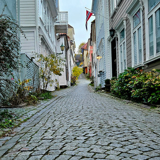 Historic wharf district in Bergen known for its row of colorful, wooden buildings lining the harbor. Once a vital trading hub, it now houses shops, restaurants and galleries. Everything is crooked.